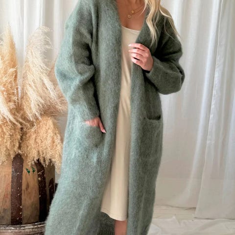 Pitkä kaunis edestä avoin villa mohair mix neule takki koko onesize Neuletakissa on kaksi etutaskua.