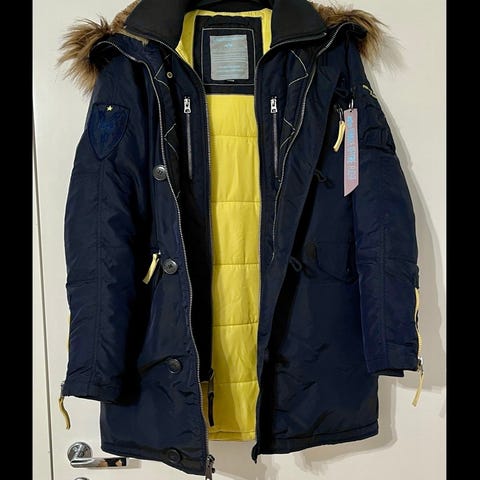 Hyväkuntoinen talvitakki kylmiin keleihin. Hupussa irroitettava karva ja vyötäröllä kiristysnauha. Ei postitusta.