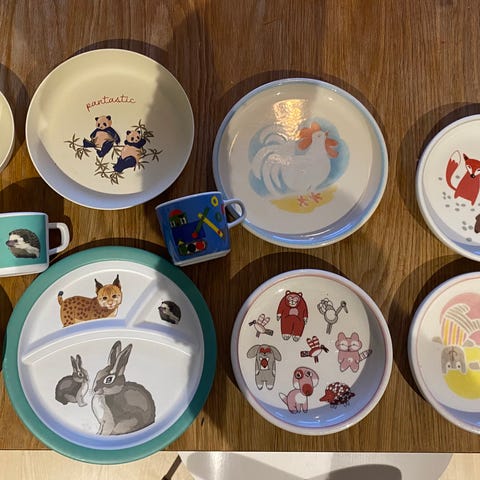 Pillipulloja, muovisia aterimia (lapsen käteen muotoiltu veitsi ja haarukka, Ikean muoviset aterimet), juomapulloja, mukeja (muumi, sammakko-kuvioinen ym), lasi (nro 3), Avent tuttipullo. Lisäksi mukaan saa pari säilytyskoria.