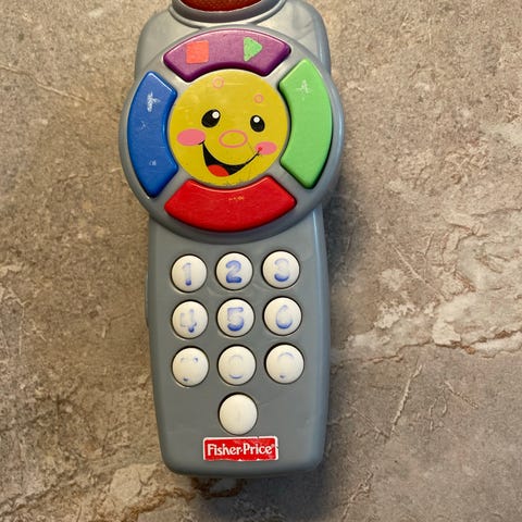 Kaukosäädin, joka nappeja painamalla hölisee ainakin numeroita ja värejä. Toimii. Kyljessä käyttäjän nimi haalealla.