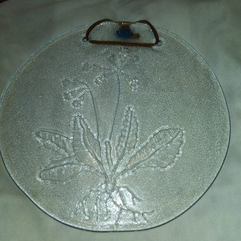 N. 6cm korkea lasikoriste. Vähän jotain naarmua pinnassa ja sormenjälkiä.