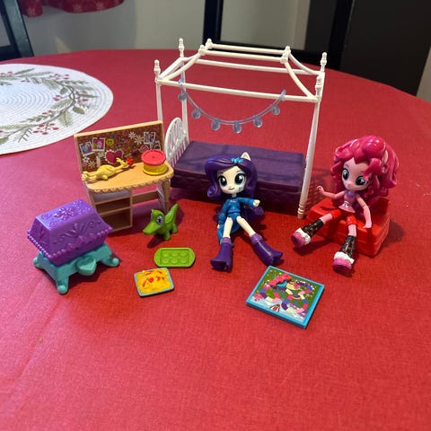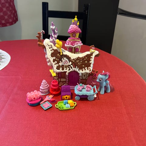 My Little Pony leikkisetti sisältää erilaisia osia, kuten pienen rakennelman, peilin, tuolin ja muita pieniä lisäosia. Sopii lasten leikkeihin ja mielikuvitusleikkeihin.