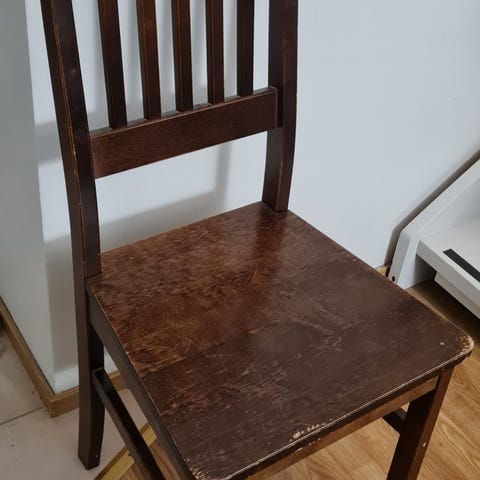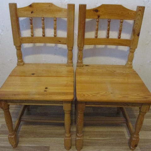 Kaksi puista keittiötuolia, joissa selkänojan pystysuorat puupalkit ja pyöristetty yläreuna. Tuolien istuimet ovat puuta ja jalat ovat tukevat. Tuolit soveltuvat esimerkiksi keittiö- tai ruokailutilaan. 25 e kpl ja raha menee lahjoituksena seurakunnan työhön.