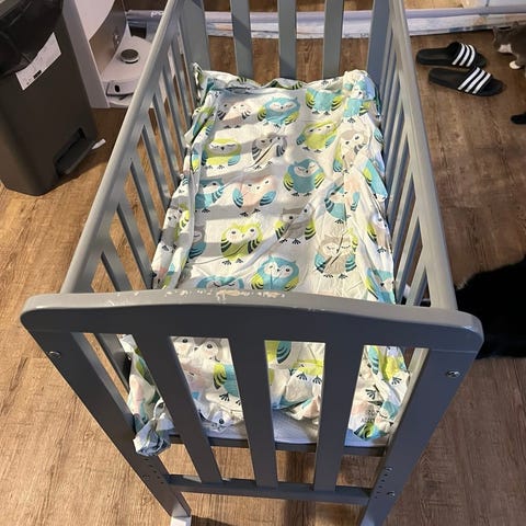 Pieni pinnasänky, 40x84cm. Alla lukkiutuvat renkaat. Ostettiin meille käytettynä, mutta ei päässytkään käyttöön. Siistissä kunnossa, jotain käytönjälkeä toki löytyy.