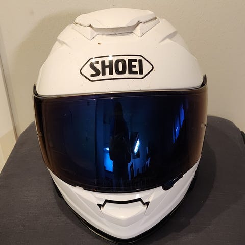 Käyttämätön valkoinen kypärä visiirillä.