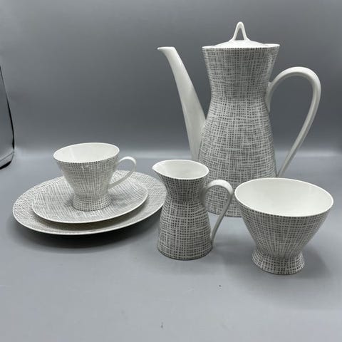 3 kpl isoja kuppeja ja 3 pienempää kuppia aluslautasineen (5 kpl), pieniä kuppeja 4 kpl aluslautasineen, kermakko, 3 kpl munakuppeja, 3 leipålautasta, hinta yhteensä