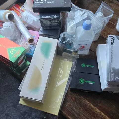 Sisältää koneen, muuntajan, kaksi poljinta sekä erikokoisia neuloja, stencil gelin, muutamaa eri väriä (päiväys mennyt eli harjoittelukäyttöön), avaamaton paketti kuppeja musteelle ja muutaman sheiverin. Saa halutessaan myös muutaman siirtopaperin mukaan! :)