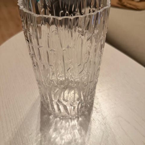Korkeus 19 cm, leveys 5,5 x 5,5 cm. Lasi harmaantunut, muuten maljakko ehjä.