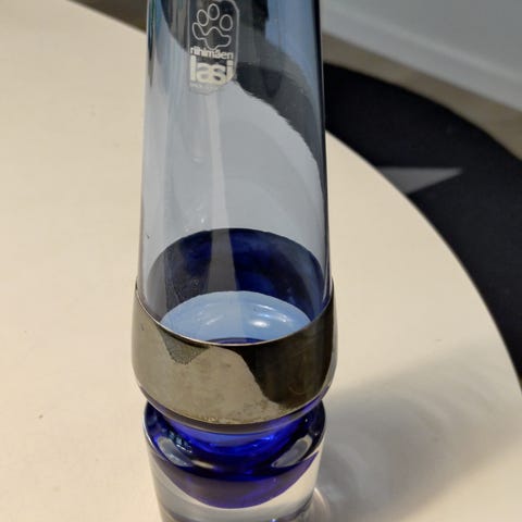 Toinen savulasivärinen, maininki-ttyppinen (vertaa Karhulan lasi maljakkoita) reflaus, ei signerausta. Hinta 5€.