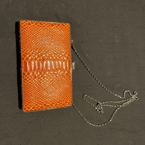 Violetti käärmeennahkakuvioinen pikkulaukku.