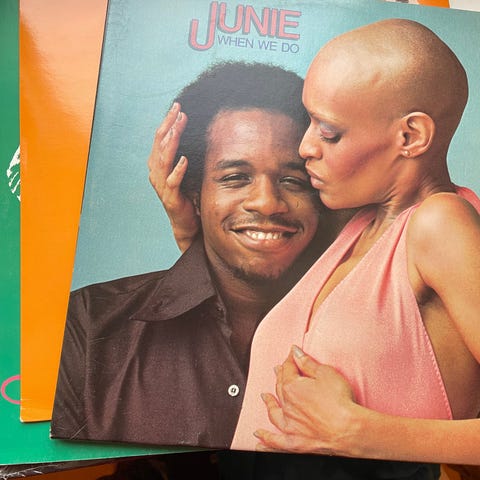 Kunnossa oleva vinyylilevysoitin ja 20 vinyylilevyä.