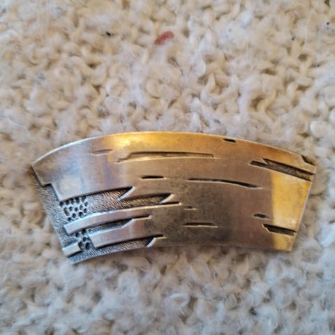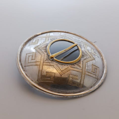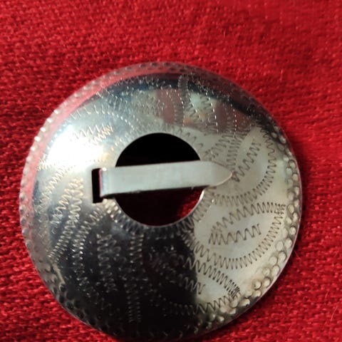 Kaunis paljinsolki Pyhäjärven pukuun kuuluva, halkaisija 6,5cm, hopeoitua messinkiä.