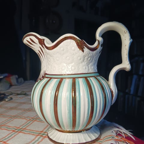 Vanha kannu vaikka maljakoksi. Käsinmaalattu Belgiasta, H. Bequet Quaregnon. Korkeus suuhun asti 18cm, levein kohta 11cm.