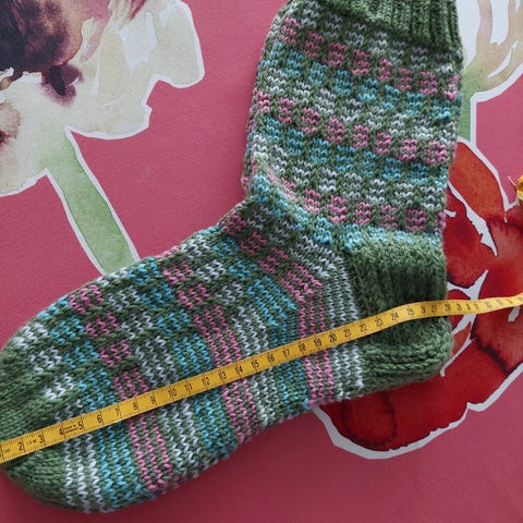 Sukat neulottu ohuesta Sulo sukkalangasta. 75% villaa ja 25% polyakryylia. Isommat sukat hinnaltaan 10 euroa ja pienemmät 8 euroa.