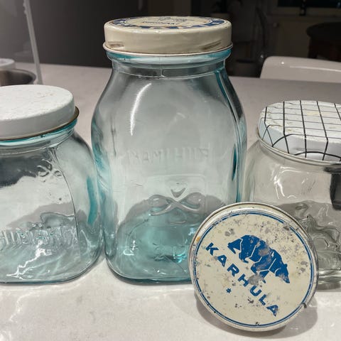Riihimäen vanhat lasipurkit, eri kokoisina.
