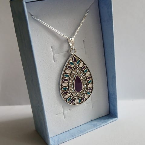 Kaunis Sininen kuvio Pisara Zirkoneilla jonka pituus on 3,3cm ja ketjun pituus on 50cm,925 leima ketjussa,lahjarasia tai lahjapussi.(Postitus kirjeenä tai nouto)