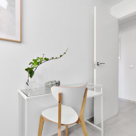 Hyväkuntoinen, valkoinen työpöytä lasisella työtasolla ja yhdellä hyllyllä. Metallinen runko. Lasissa hieman kiinnittynyttä pölyä, pieniä naarmuja yms. jälkiä, mutta täysin ehjä (ei halkeamia). Myös runko ehjä.