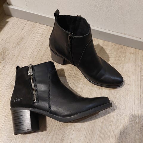 Myydään ihanat mustat Rieker nilkkurit koossa 39. Vetoketjut sivussa, pehmeä vuori sisällä ja ihanan pehmeät muutenkin jalan alla. Harmittaa luopua, mutta omaan jalkaani ei korkokengät enää sovi. Oikein siisti kunto, ainoana moitteena kengän takaosasta päällinen (nahkaa tai mahdollisesti tekonahkaa, en muista varmuudella) on hiukan alkanut lohkeilla.