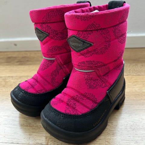 Kuoma lasten talvikengät koko 23 unisex. Kengät ovat väriltään pinkit ja mustat, ja ne on suunniteltu kestämään kylmiä olosuhteita. Sisäpuolella on lämmin vuori, joka tarjoaa lisälämpöä. Kengissä on tukeva pohja, joka parantaa pitoa erilaisilla alustoilla.