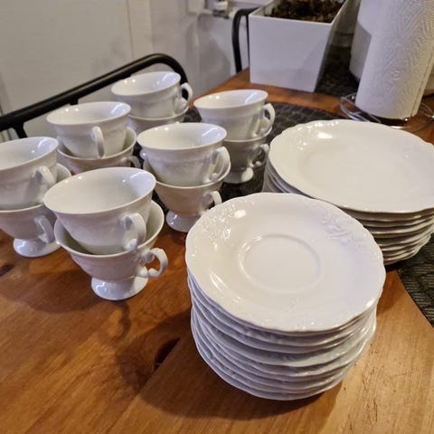 Kuvanmukainen 6 hengen Wawel astiasto. Astioissa kaunis kukkakoristus. Käyttämätön ja täysin ehjä. Tarjoiluastioita, kannu yms. Saa tarjota.