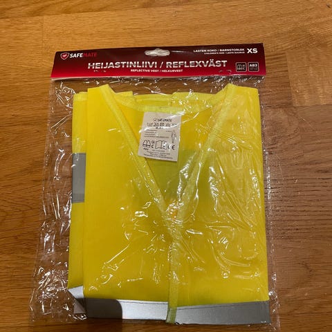 Hyvässä käytetyssä kunnossa oleva heijastinliivi. Koiran naamassa jotain pientä jälkeä, mikä ei vaikuta käyttöön kuitenkaan. Kuminauhojen reunoissa kihartumaa mutta kuminauhat edelleen toimivat, eli palautuvat venytyksestä normaalisti.