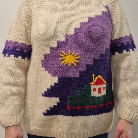 Harmaa lammaskuvioinen aitoa suomenlampaan villaa, mol. puolilla kuviointi. Koneneulottu.