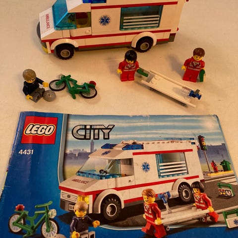 Setti 4431 ambulanssi. Puuttuu tarroja ja 3 osaa on korvattu erivärisillä. Kahden hahmon kasvot hieman erilaiset kun alunperin. Naishahmon hiukset erilaiset.