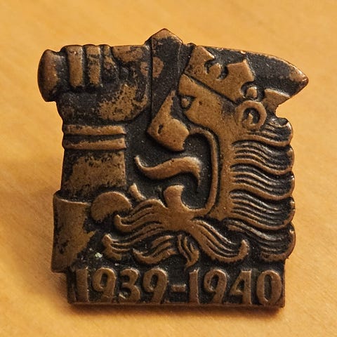 Merkki, jossa on vuosiluvut 1939-44 ja henkilöhahmon kuva. Merkki on valmistettu metallista ja sopii keräilyyn tai muistoesineeksi.
