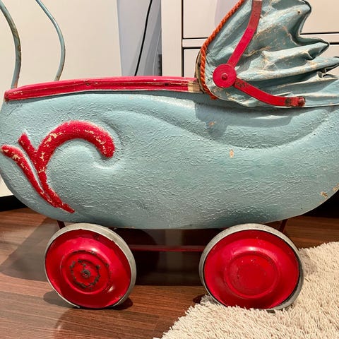 Vanha rottinkinen nukenvaunu. Soveltuu sisustuselementiksi.
