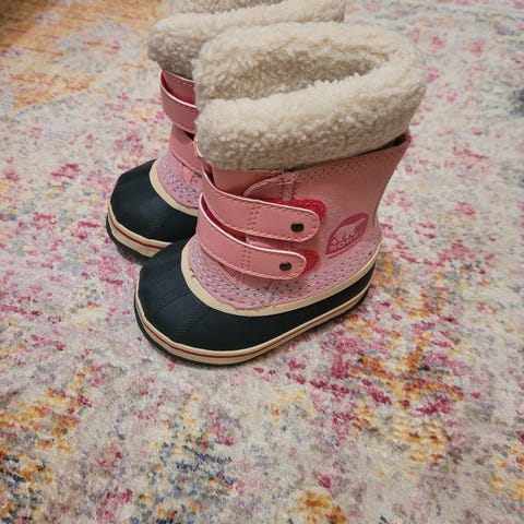 Pienet sorelit, koko 21. Sisämitta 9 cm. Pientä käytön jälkeä on karvassa ja tarroissa. Hyvin vähällä käytöllä kuiten olleet. Soreleiden tapaan irrotettava ssisähuopa.