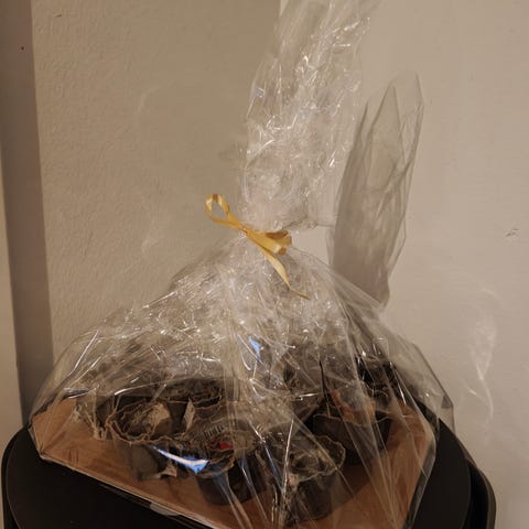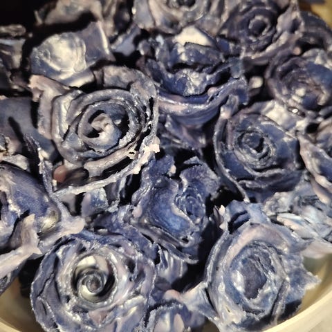 Myytävänä käsintehtyjä sytykeruusuja. Valmistettu kananmunakennoista ja ruusut kastettu sulaan steariinin. Näillä nuotion tai takan sytyttäminen käy kätevästi. Sytykeruusut pakattu sellofaanipussiin.