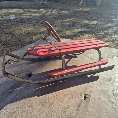 Vanha rattikelkka. Vaatii hieman kunnostusta. Somistus käyttöön.