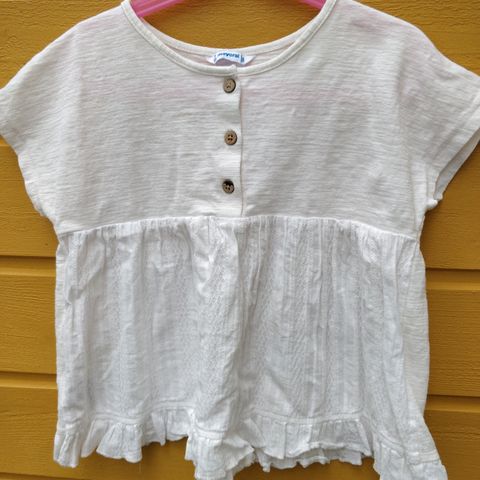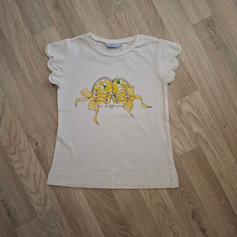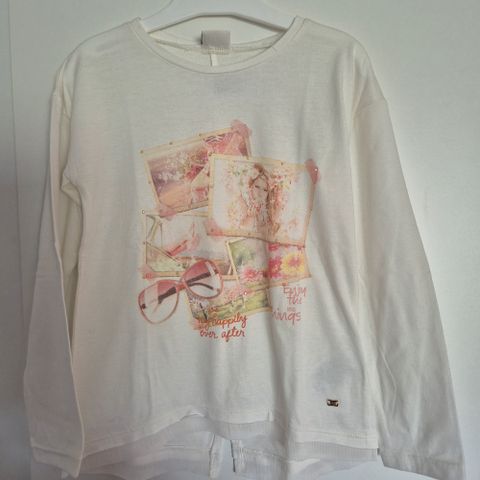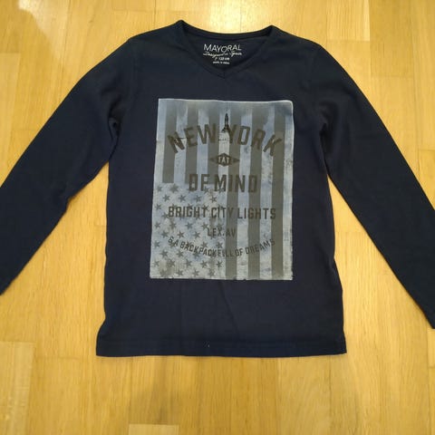 Kuvioitu Mayoral paita koko 122cm. Painatus on halkeillut jonkin verran ja se huomioitu hinnassa.