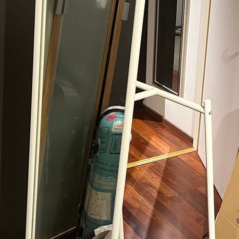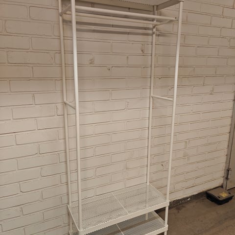 Pystynaulakko peilillä. Pari tasoa esim. avainten säilytystä varten. Takana ja sivulla tangot vaatteiden säilytykseen.