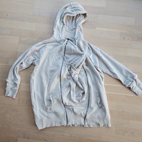 Kukallinen Seraphinen raskaus- ja kantohuppari irrotettavalla paneelilla koossa L. Isoa kokoa, itsellä harvoilla käyttökerroilla vauvakin mahtui hupparin alle ilman lisäpaneelia.