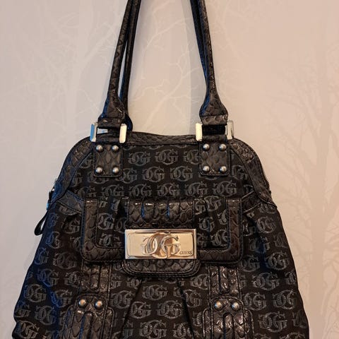 Laukku on hyvässä kunnossa, mutta reunat hieman kuluneet sivuilta. Laukussa on kiiltävä pinta ja siihen on painettu Guess-logokuviot. Vetoketjulla. Sisätasku vetoketjulla ja kaksi avointa sisätaskua. Sopii arkeen ja erilaisiin tilaisuuksiin.