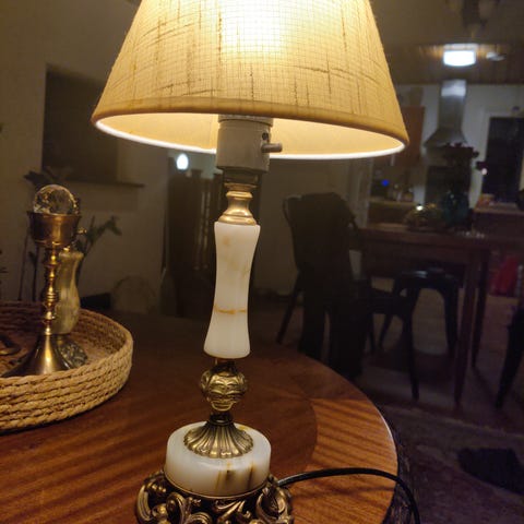 Kotimaisen Sarion valmistama, vanha messinkinen pöytälamppu. Varjostin puuttuu mutta muuten kunto hyvä ja valaisin toimii.