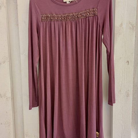 Myydään kauniit Pompdelux trikoopuuvillainen Poldana mekko ja sukkahousut lavender. Toisessa ilmoituksessa näkyy mekko kokonaan. Mekossa pitkät hihat.