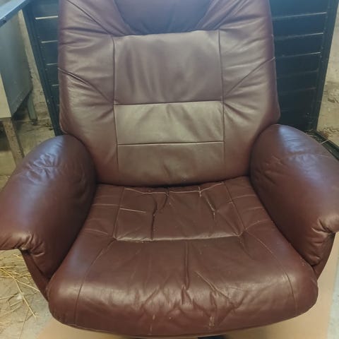 Tuoli oletettavasti nahkaa, tausta tekonahkaa. Hyvässä kunnossa. Rahi on nahkaa, sen pääsi tarkistaan nurijalta puolelta. Rahissa pientä raapimisjälkeä reunan alueella. Haku.
