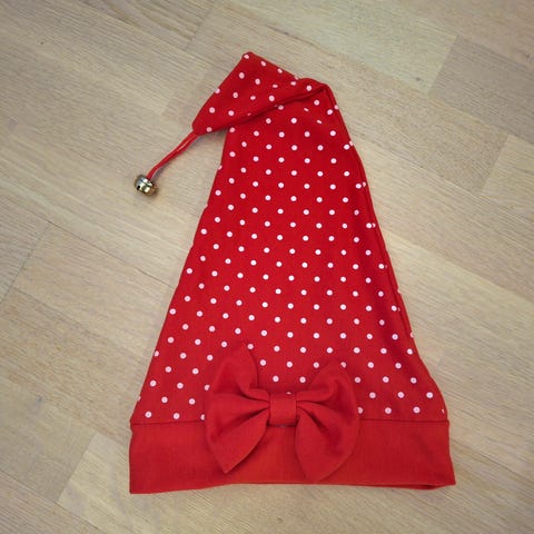 Harrastajaompelijan tekemä punainen tonttulakki rusetilla, napakkaa mutta venyvää kangasta. Ollut käytössä alle 1-vuotiaasta noin 3-vuotiaaseen.