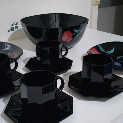 Myynnissä myös Teema helmenharmaat 17cm leipälautaset, Taika sarjan mustavalkoiset mukit.