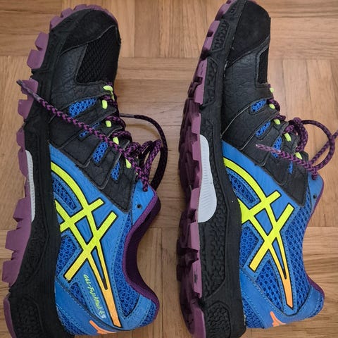 Muutaman kilometrin, kerran käytetyt Asics gel-fujisetsu 3 GTX, koko 40,5. Ei istunutkaan omaan jalkaan. Siis uudenveroiset, lähes käyttämättömät. Veden kestävät (goretex). Mustat, oranssi kuvio. Pohja violetti.