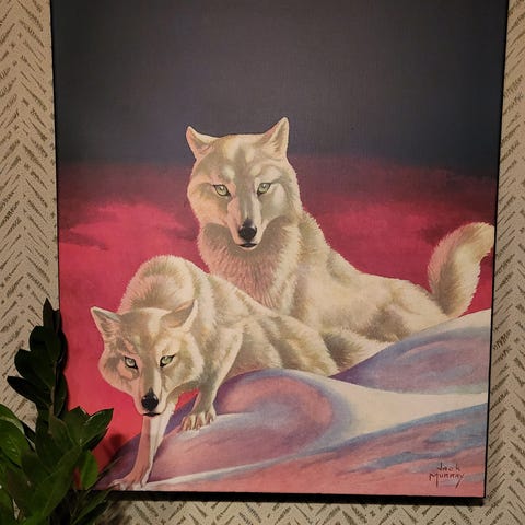 Taulu kuva intiaanista hevosella ja biisonista sinisellä taustalla. Teos on kehystetty.
