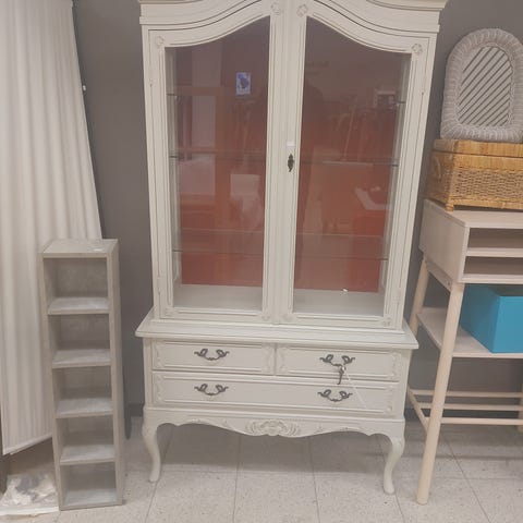 Maalaisromanttinen vitriini tarpeettomana uuteen kotiin. Valot lisätty. Korkeus 185cm, leveys 50cm ja syvyys 45cm. Nouto Espoon Kauklahdesta. Maksu mobilepay.