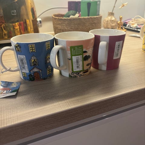 Arabia Muumi mukit, 2 kappaletta. Mukeissa on Muumi-aiheiset kuvitukset, toinen keltainen ja toinen punainen. Materiaali posliinia. Uusia