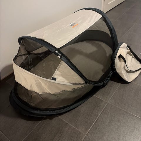 Hyväkuntoinen, pieneen pakkautuva matkasänky, jossa ilmatäytteinen patja (paksuun noin 3 cm) ja pohjalle vielä toinen pehmuste. Kätevä reissussa, kankaassa uv- suoja ja ovessa hyttysverkko vetoketjulla. Kuvassa pieni pohjan tahra. Linkki vastaavaan tuotteeseen, mutta tämä malli on vanhempi.