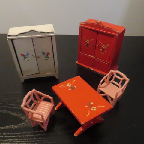 Nukkekodin lasten lelujen kalustesarja sisältää vaaleanpunaisen pinnasängyn, sinisen kylpyammeen ja sinisen syöttötuolin. Kalusteet on valmistettu muovista. Made in W.Germany,/JEAN