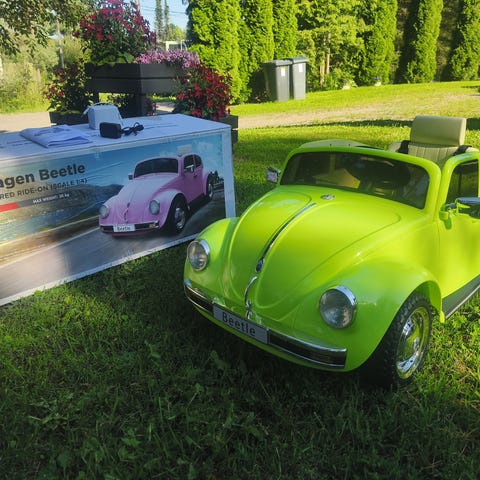 Lasten sähköauto VW Beetle valkoisena. Sopii lapsille leikkiautoiluun sisä- ja ulkokäytössä. Menee eteen ja taakse, myös musiikki soi.