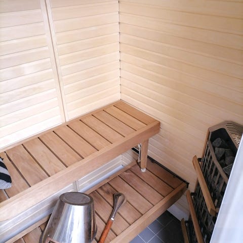 Lauteet ja paneloinnit hyvässä kunnossa, kiuas liitäntä normaalii pistorasia (schuko)