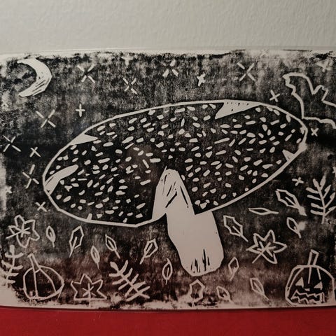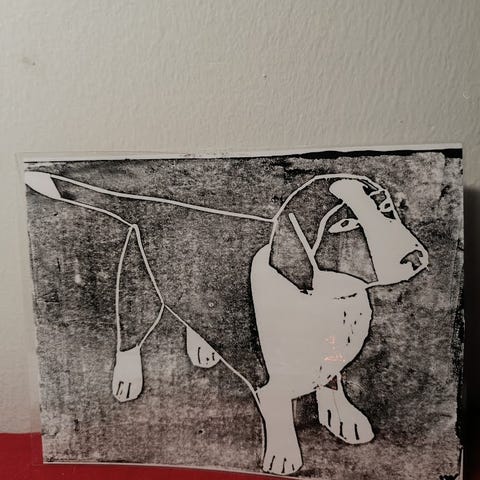 Kissa aiheinen linopainettu printti a5 kokoiselle paperille ja lopuksi vielä laminoitu
